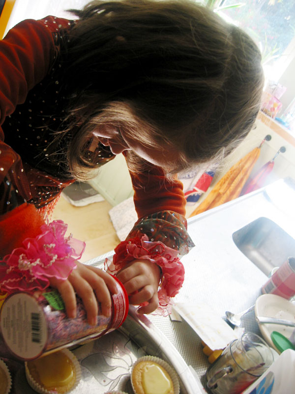 | Leora decoreert de cakejes, heel aandachtig schudt ze de glittertjes in het glazuur | Het resultaat..... (ziet er eigenlijk lekkerder uit dan ze zijn, het gele glazuur smaakt wat kunstmatig!) |